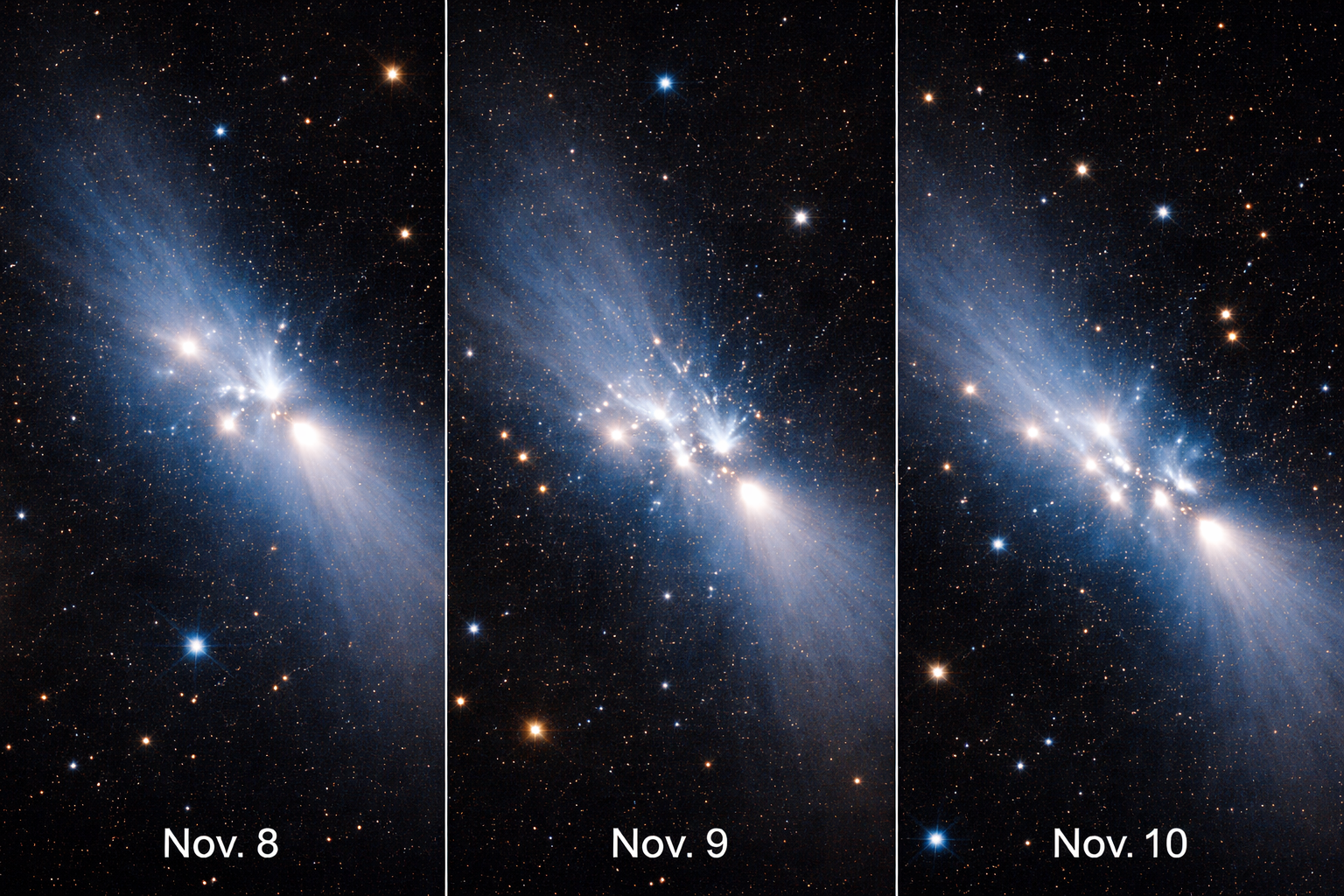 Hubble je komet opazoval tri zaporedne dni, 8., 9. in 10. novembra 2025. Na teh posnetkih je bilo videti, da se je jedro kometa razlomilo na najmanj štiri večje dele, med samim opazovanjem pa se je razcepil še eden od manjših fragmentov. NASA poudarja, da je to prvič, da je Hubble komet ujel tako zgodaj v procesu razpadanja, torej le nekaj dni po samem začetku razkroja, ne šele tedne pozneje, kot se običajno zgodi pri podobnih primerih.