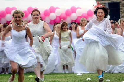 Udeleženci te dirke nosijo poročne obleke in čevlje ter se nato pomerijo…